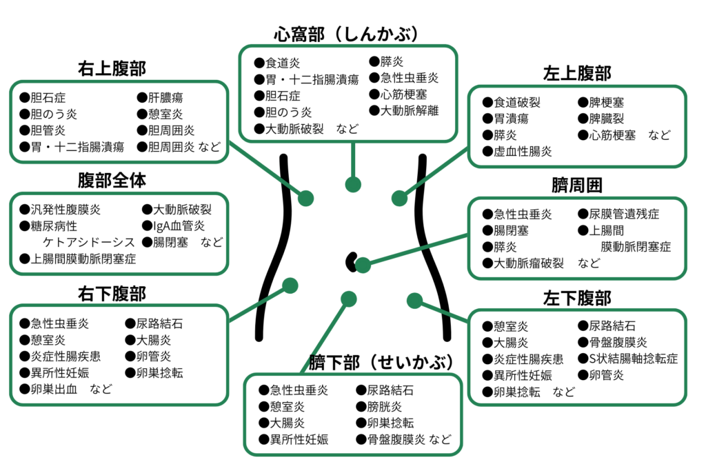 腹痛は症状が生じる場所によって疑う病気が異なります。